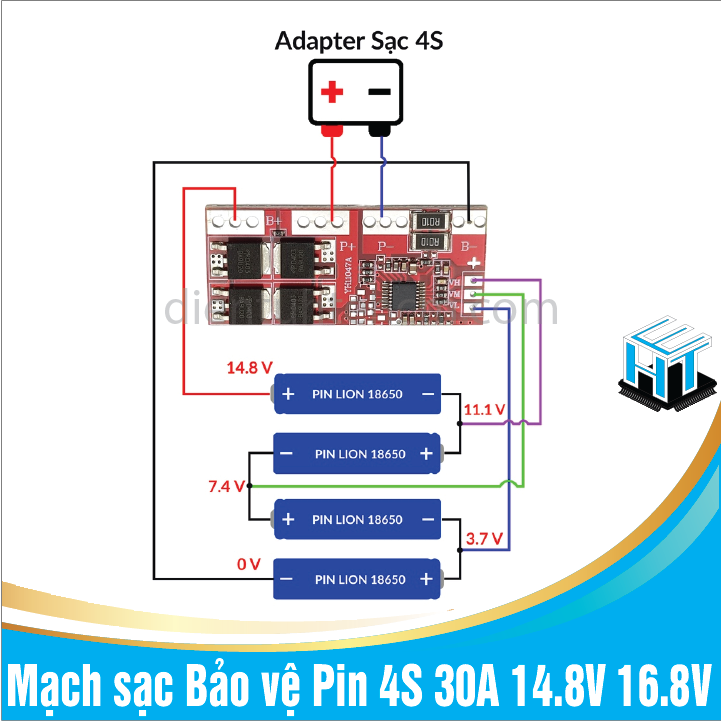 • Bảng mạch sạc và bảo vệ pin 4S 30A lithium, phù hợp với điện áp danh định 14.4V pin lithium, pin lithium 14.8V, pin lithium 16.8V.