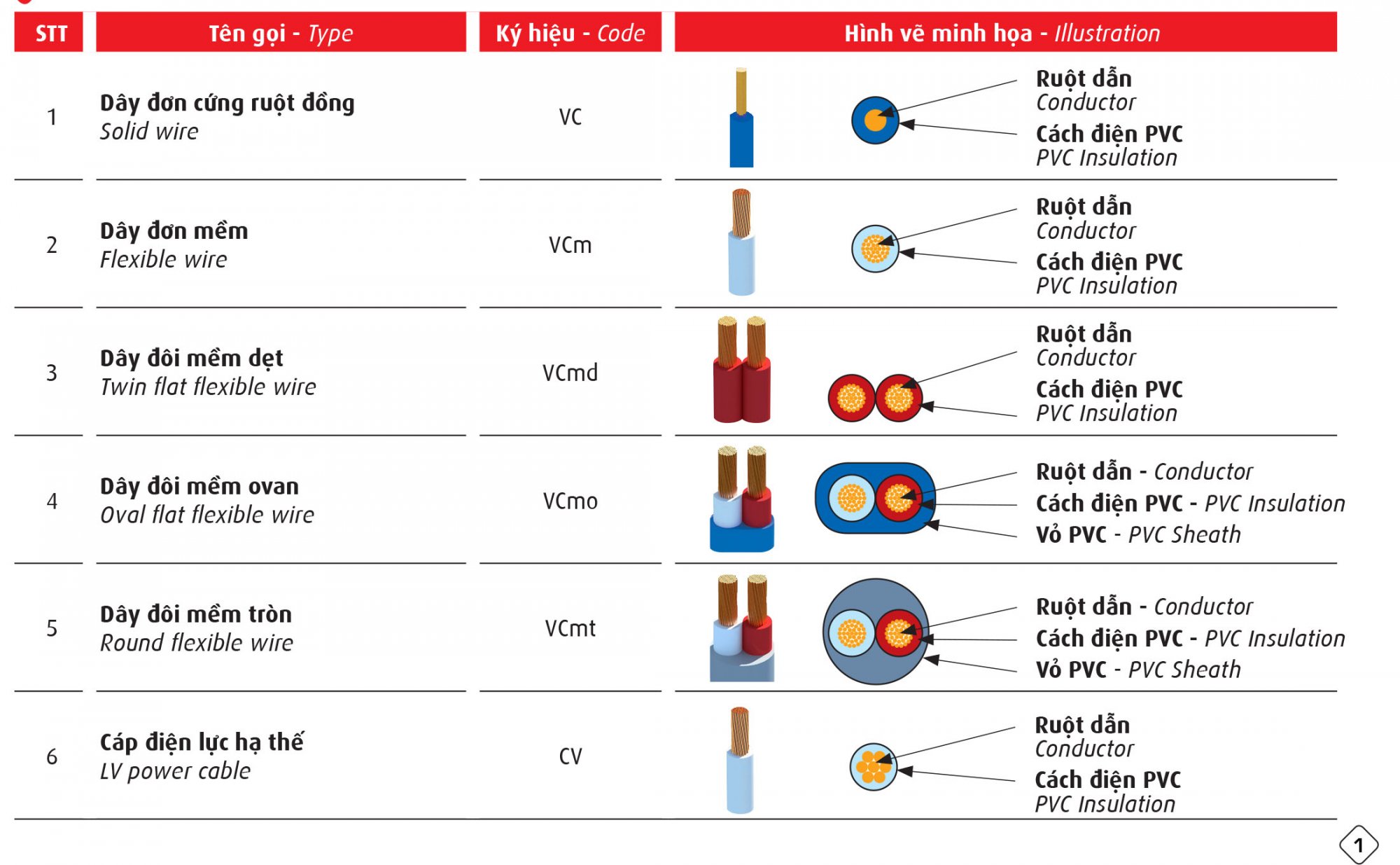 ĐỌC TIẾPVC - 0,5 – Dây cứng một sợi đồng, cách điện bằng nhựa PVC có mặt cắt danh định 0,5mm2 VA - 2,5 – Dây cứng một sợi nhôm, cách điện bằng nhựa PVC có mặt cắt danh định 2,5mm2 VCm – 0,5 x 2 – Dâ...