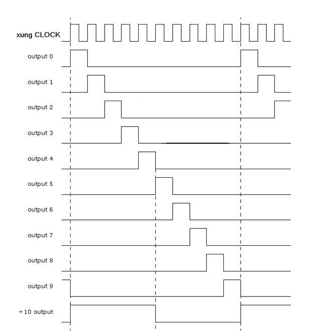 IC 4017 là ic đếm thập phân tức đếm hệ 10, nó đếm xung clock. Khi ta đưa tín hiệu xung vào chân clock thì ic sẽ đếm xung và xuất ra 10 output tương ứng với 1 xung clock.